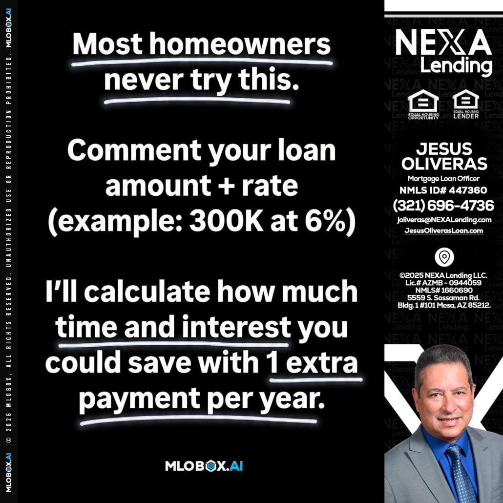 most owners - Jesus Oliveras -Mortgage Loan OfficerHi, my name is Jesus Oliveras. I’m a Loan Officer with NEXA Lending LLC., offering personalized mortgage solutions, fast customized quotes, great rates and service with integrity.